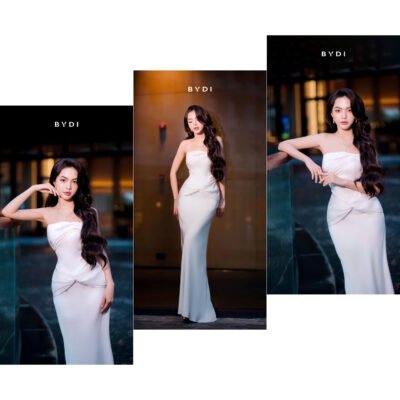 Chiếc đầm trắng dài với phần trễ vai khéo léo cùng phom dáng suông nhẹ tạo sự uyển chuyển, dịu dàng khi nàng di chuyển. Đây là mẫu đầm rất được ưa chuộng cho prom hoặc dạ tiệc mùa hè.