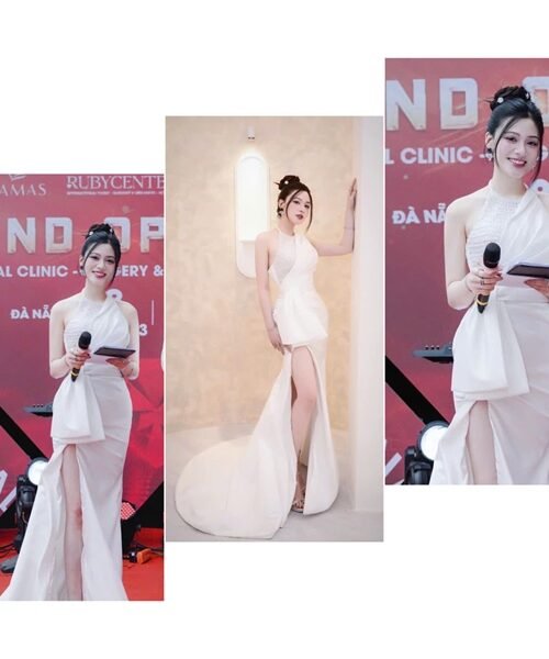 Đánh giá Đầm dạ hội thiết kế KYGO – Trắng- Cổ yếm kèm choàng, có nơ bên hông- Size S M