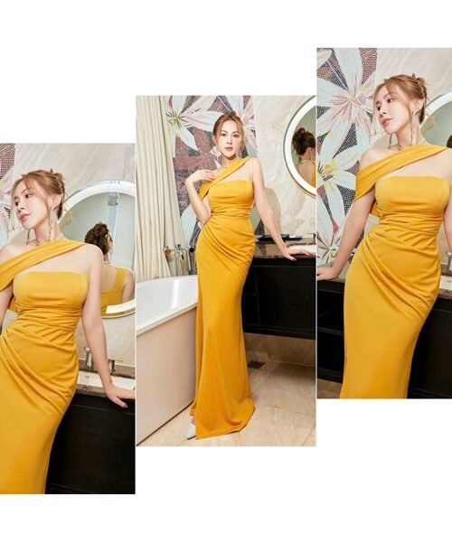 Đầm dạ hội thiết kế KYGO – Vàng – Chéo vai, nhún eo, xẻ tà, năng động – Size S M
