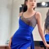 Đầm dạ hội thiết kế KYGO – Xanh dương – 2 dây đính kim sa lấp lánh, xẻ tà, nổi bật, gợi cảm – Size S M