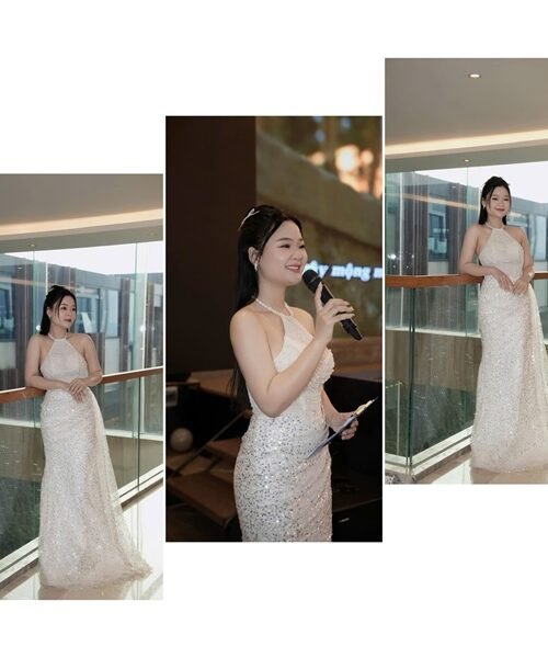 Đánh giá Đầm dạ hội thiết kế Luxury KYGO – Trắng bling – Cổ yếm, đính đá lấp lánh, xẻ tà – Size M L