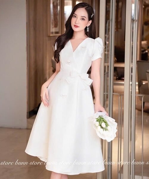 Đánh giá Đầm ngắn thiết kế KYGO – Be – Tay bồng, đính nơ, thanh lịch nhẹ nhàng – Size S M